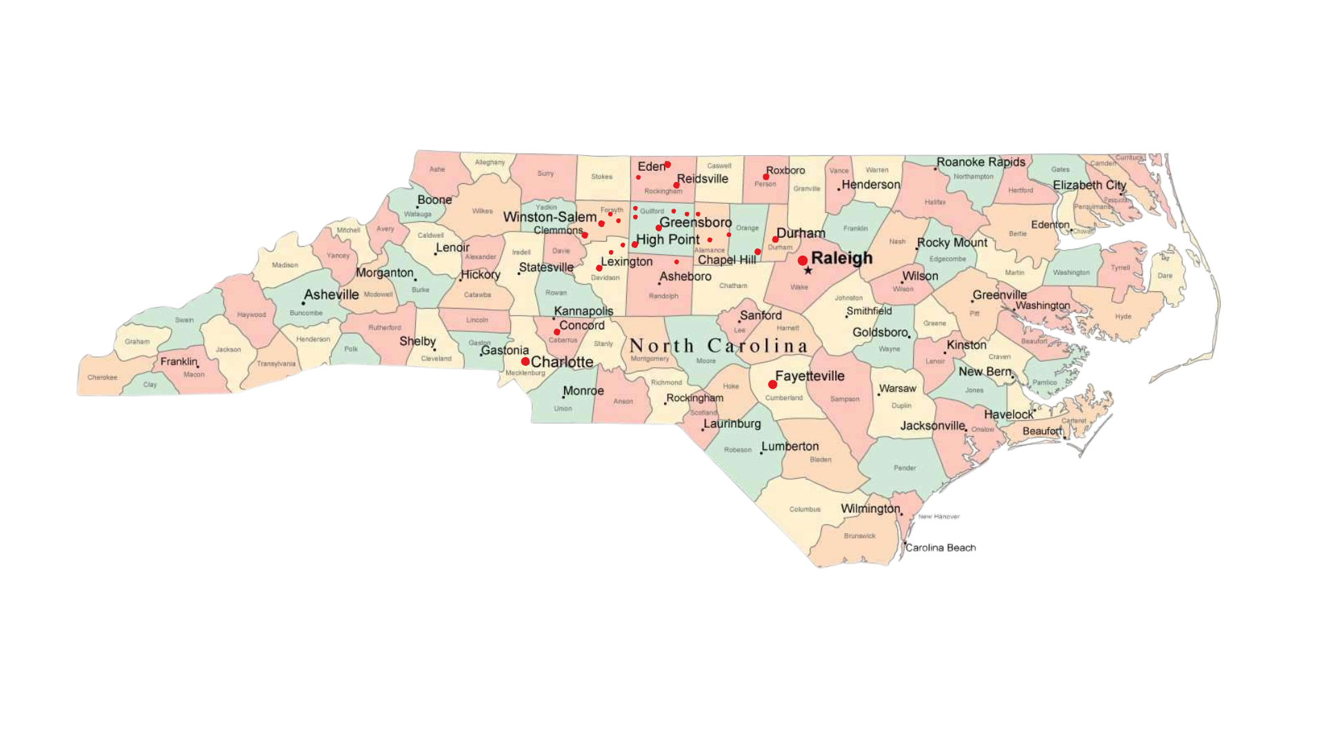 | Brown SummitMcLeansvilleWalkertownStokesdale RaleighChapel HillDurhamCharlotte ConcordMebaneWhitsettLibertyRoxboro